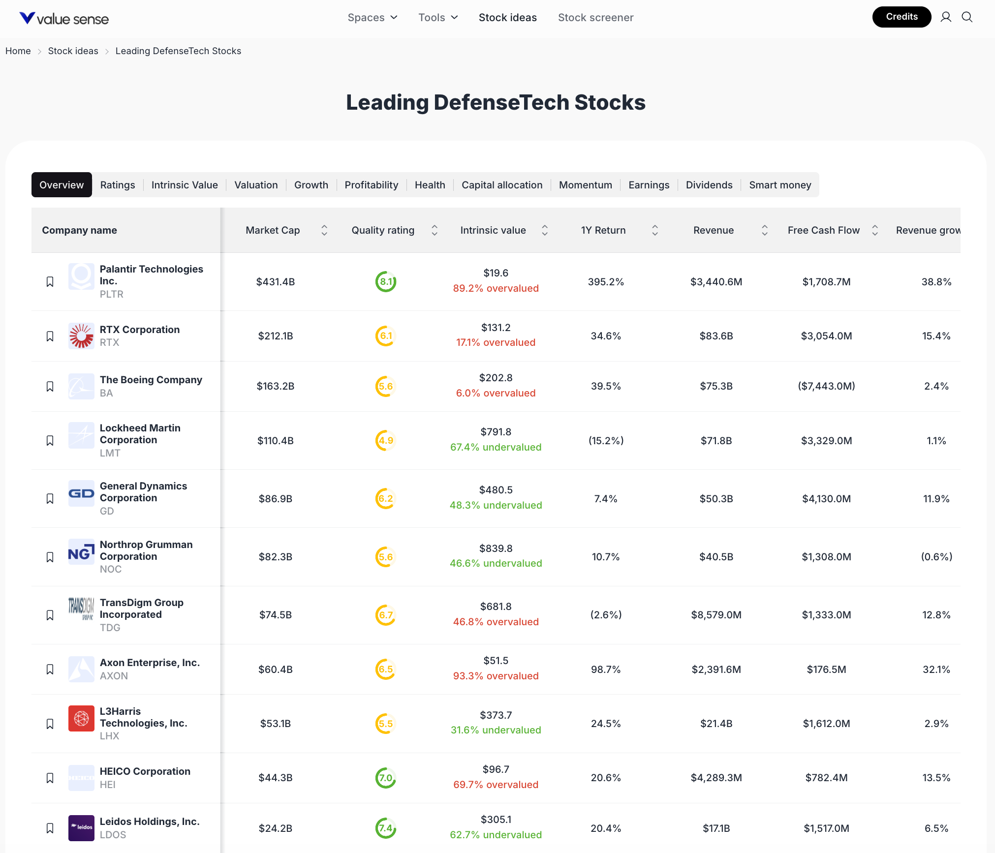 The 2025 DefenseTech stock watchlist features a diverse mix of industry leaders and innovators, each offering distinct value, growth, and risk profiles. By leveraging ValueSense’s data-driven analysis, investors can identify opportunities in both undervalued and high-momentum stocks. Explore ValueSense for deeper insights and ongoing research to support your investment decisions.