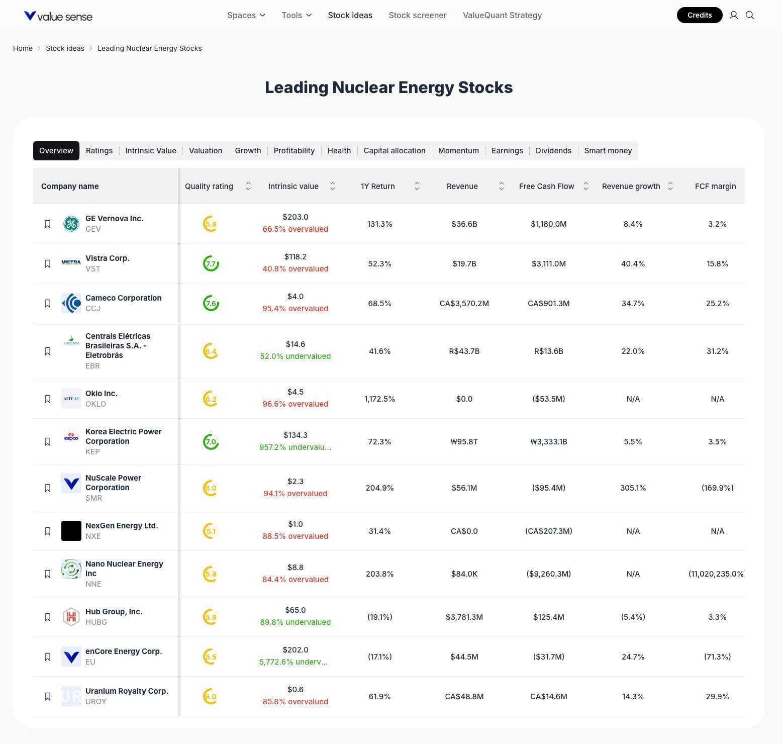 The nuclear energy sector is experiencing renewed interest as clean energy demand rises and governments invest in next-generation power infrastructure. Our selection methodology focuses on stocks with strong quality ratings, attractive intrinsic value, robust cash flow, and clear growth catalysts. We analyze a blend of established leaders and innovative disruptors, using ValueSense’s proprietary ratings and financial metrics to identify the most compelling opportunities for 2026.