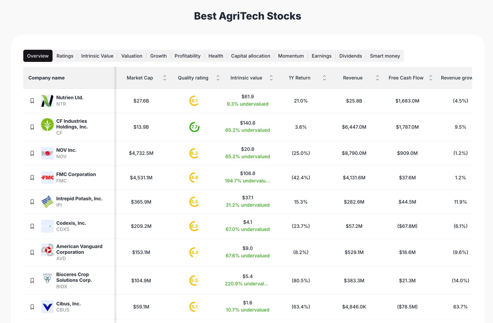 The AgriTech sector is rapidly evolving, driven by the global need for sustainable food production, efficiency, and technological innovation. Our 2025 AgriTech stock picks are selected based on a combination of intrinsic value, quality rating, revenue growth, and free cash flow. ValueSense’s methodology emphasizes stocks that are undervalued relative to their intrinsic worth, with a focus on companies demonstrating operational resilience, innovation, and sector leadership. Each stock is evaluated using proprietary ratings and financial metrics to ensure a balanced, data-driven watchlist.