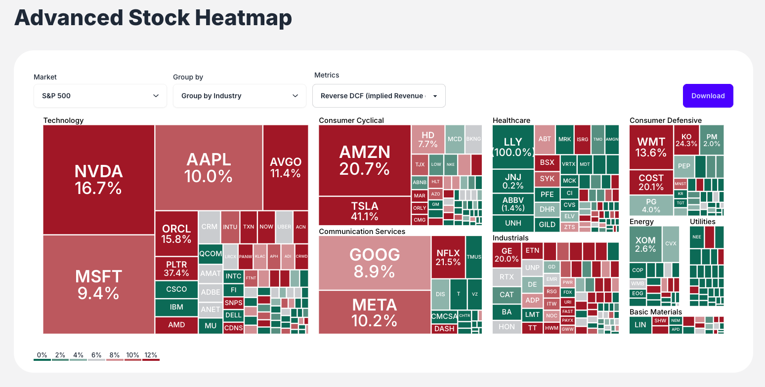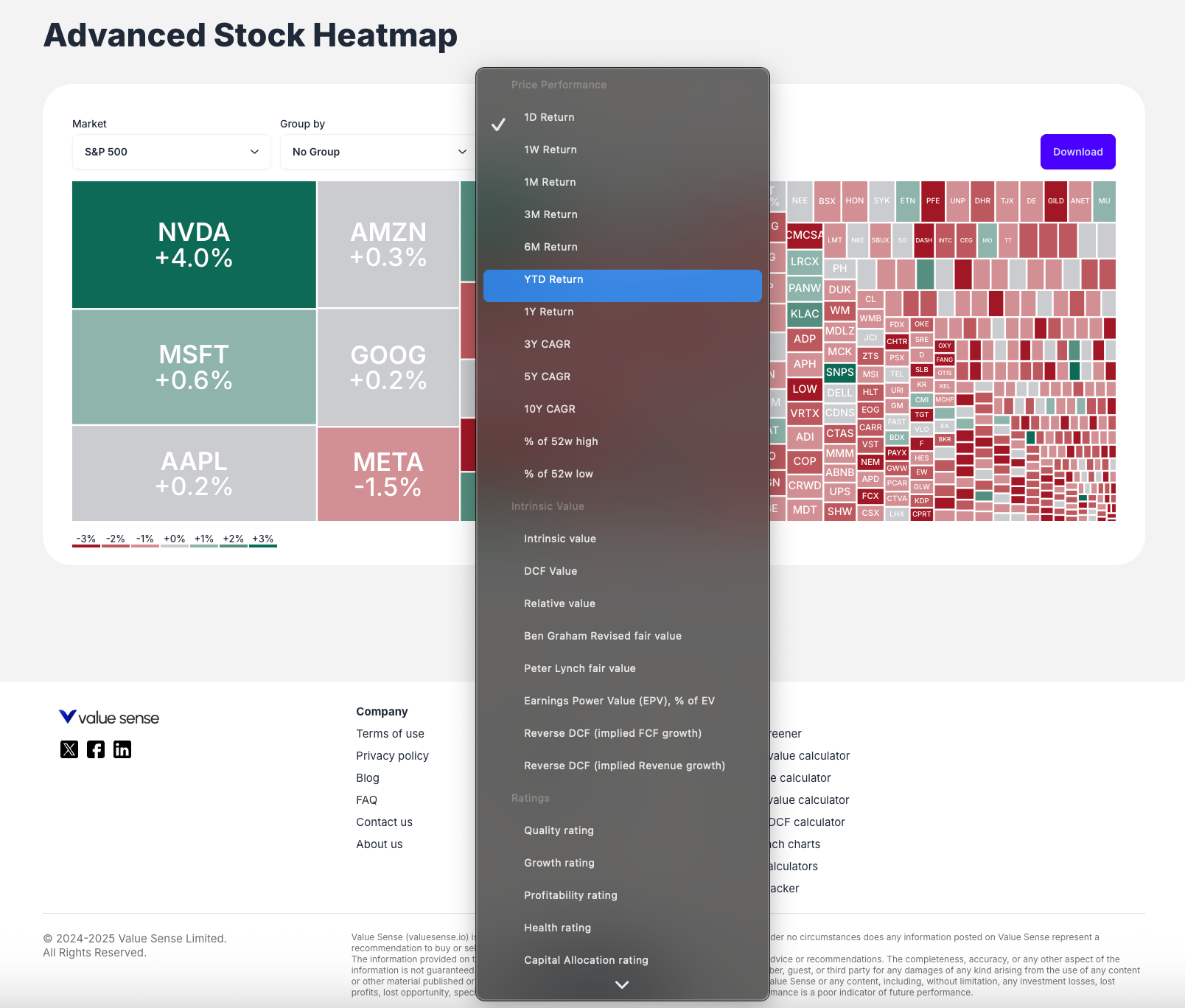 The Advanced Stock Heatmap is a powerful data visualization tool that provides an immediate, at-a-glance overview of entire stock market indices. Instead of sifting through tables of numbers, you can instantly see which stocks, industries, or sectors are performing well or poorly based on any selected financial metric, helping you quickly identify market trends, spot outliers, and discover investment opportunities.