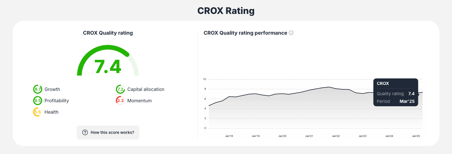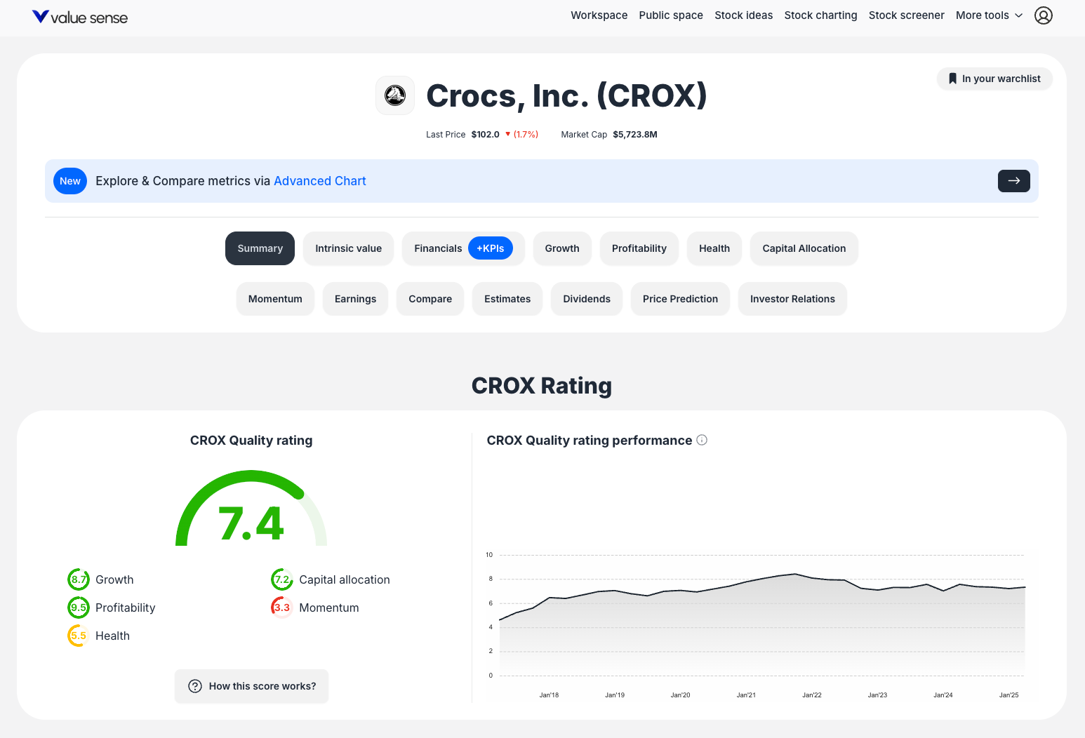 Visual Rating System: Each analysis section includes color-coded rating gauges that provide instant insights into the company's performance. For example, you might see ratings like "Quality Rating: 7.4" or "Growth Rating: 8.7".