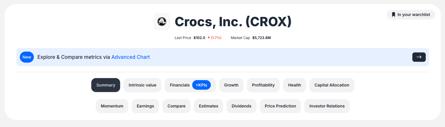 Once you select a stock from the search results, you'll land on the company's dedicated analysis page. Here you'll see: