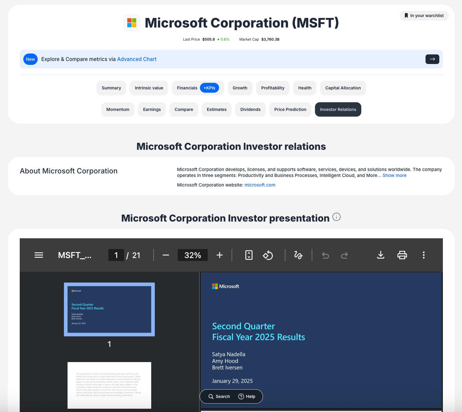 The IR content is fully integrated into the main company analysis page, appearing alongside:
