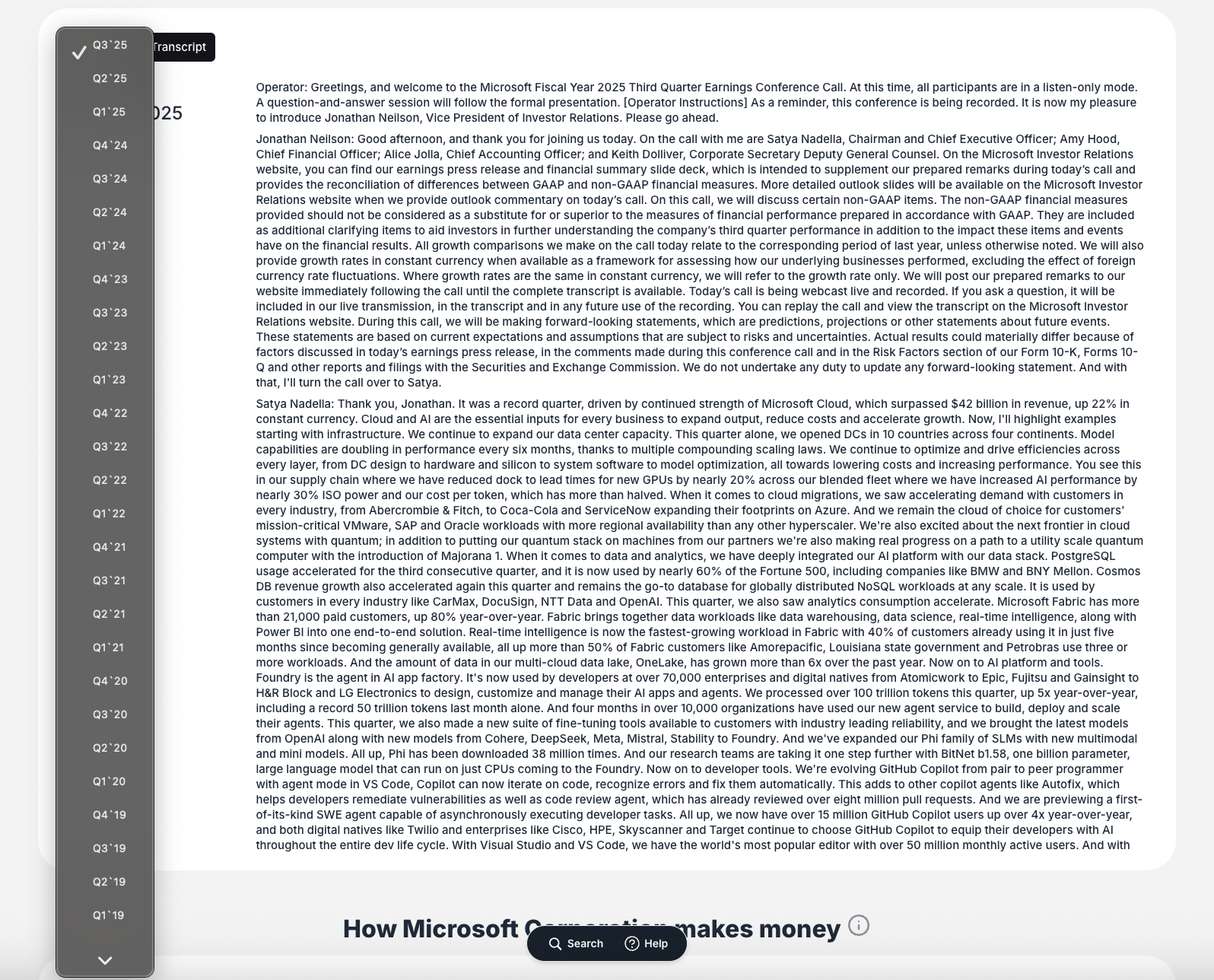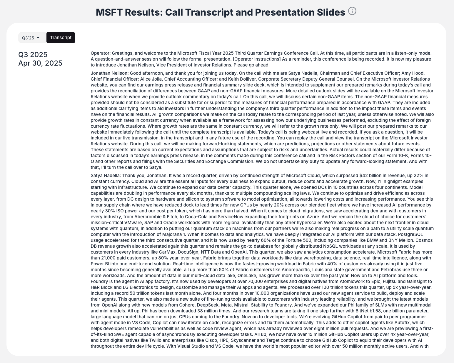 - Historical Depth: Over five years of available transcript data (e.g., back to Q1 2019 for Microsoft)