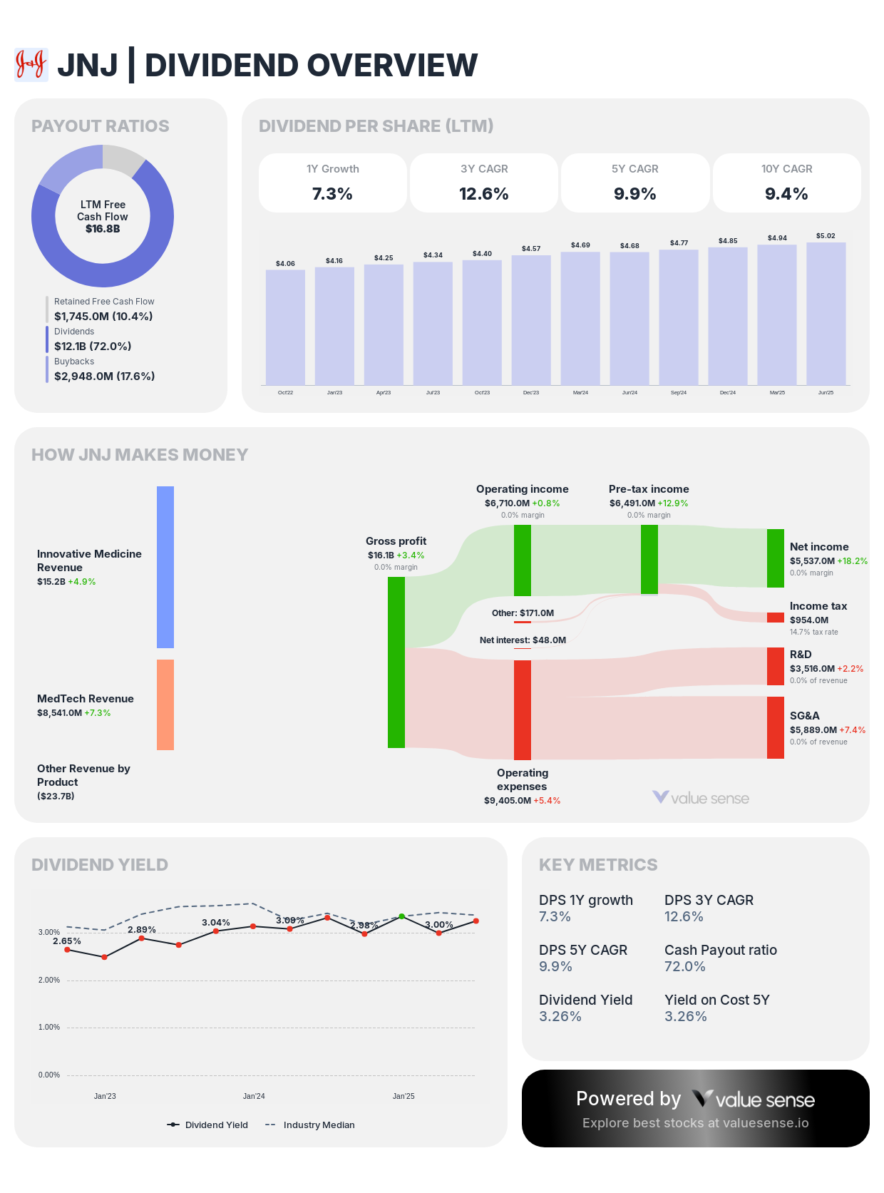 A: Johnson & Johnson's dividend sustainability is exceptional with a 37% payout ratio, $6 billion+ free cash flow in H1 2025, and $18.6 billion cash position. The ultra-conservative payout provides significant safety margin even during economic downturns, supporting the 63-year dividend growth streak.