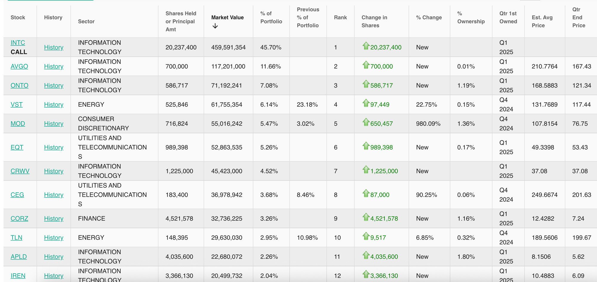 The portfolio's concentration in AI infrastructure companies—from semiconductor manufacturers to power generators—reflects deep conviction in the massive capital requirements for advanced AI development. While the heavy concentration in Intel represents significant risk, the overall positioning appears well-aligned with the multi-trillion-dollar AI infrastructure buildout ahead.
