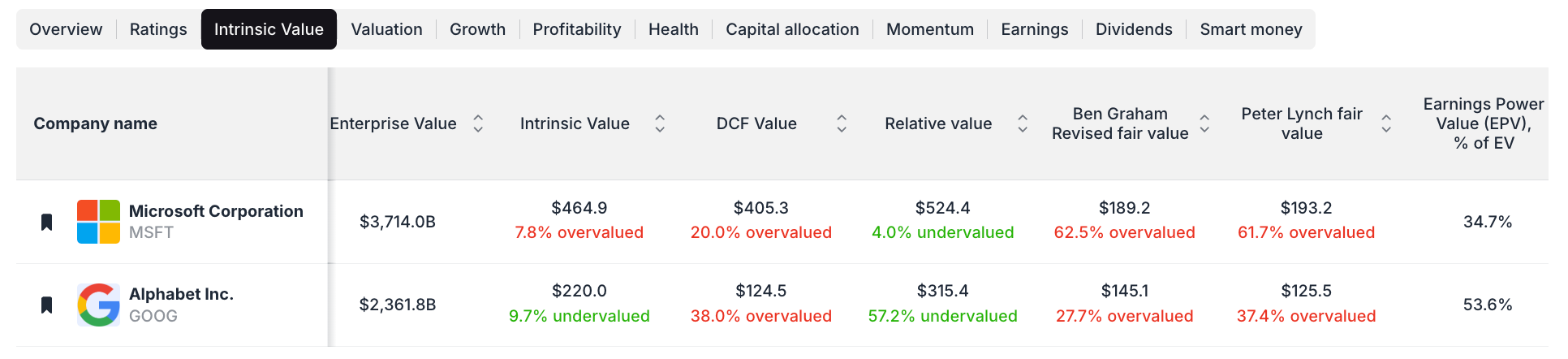 | Intrinsic Value Status | 7.8% Overvalued | 9.7% Undervalued | GOOGL |