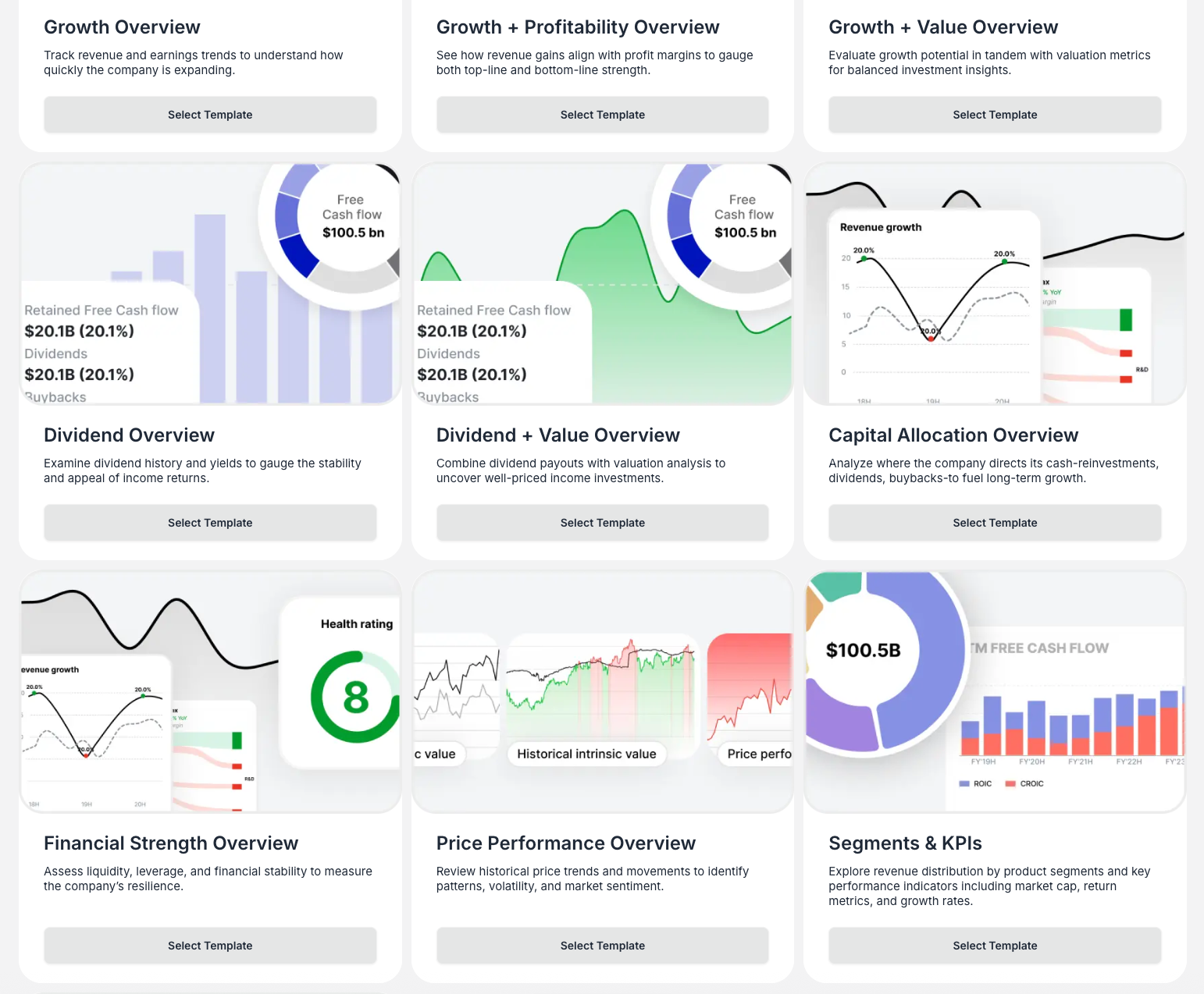 Overview Templates unlock fast, insightful stock analysis with ready-made analytical frameworks that help you quickly evaluate any company. Instead of building dashboards from scratch, you can select from a comprehensive library of curated templates, each focusing on different aspects of financial analysis to provide instant, professional-quality company reports.