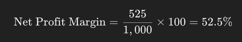 If a company has a net profit of $525 and revenue of $1,000, the net profit margin would be: