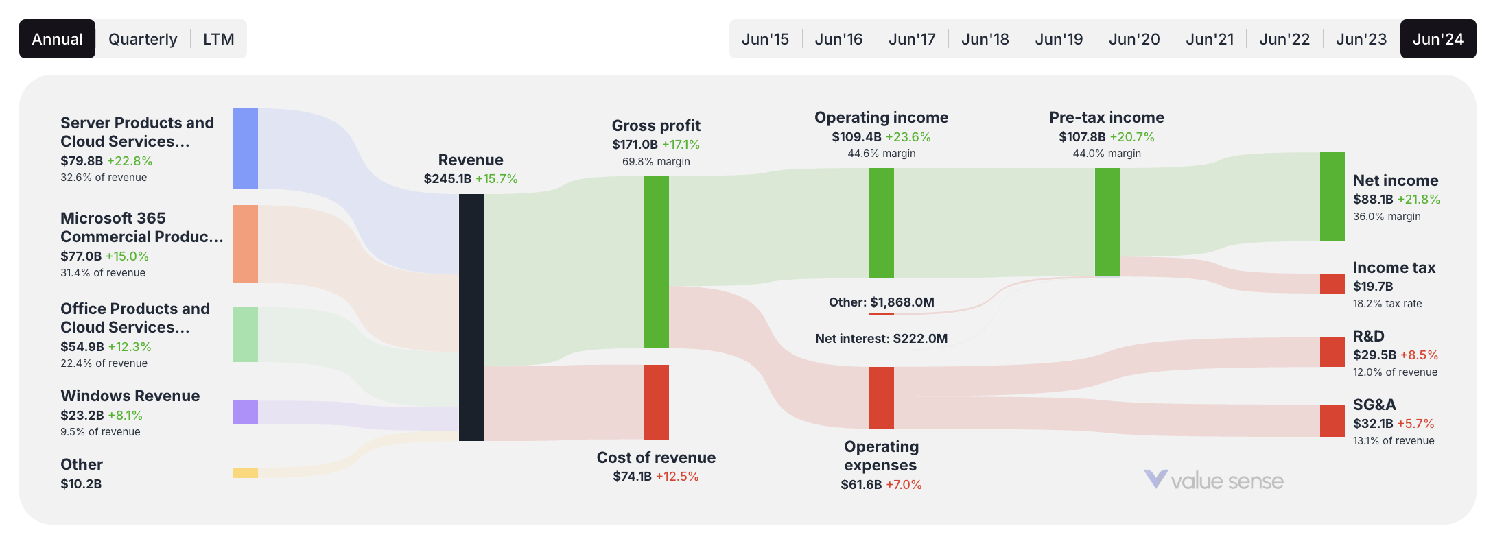 Our Smart Money Analysis begins where traditional platforms end. Take Microsoft's latest financials: $245.1B in revenue flowing through a sophisticated business model that most platforms reduce to simple line items.
