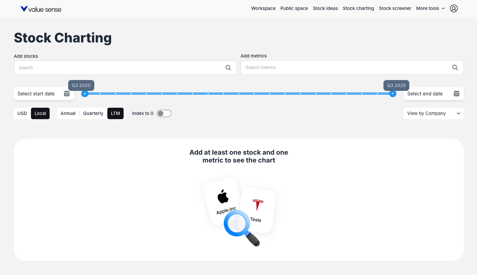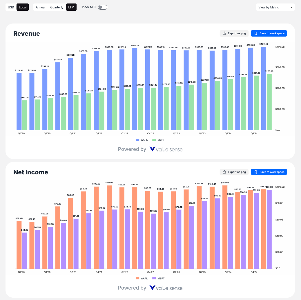 ValueSense's Stock Charting feature is designed for fundamental data analysis and visualization. Unlike traditional technical charting tools that focus on price movements, this powerful feature allows you to chart and compare fundamental financial metrics across multiple companies, providing deep insights into business performance trends.