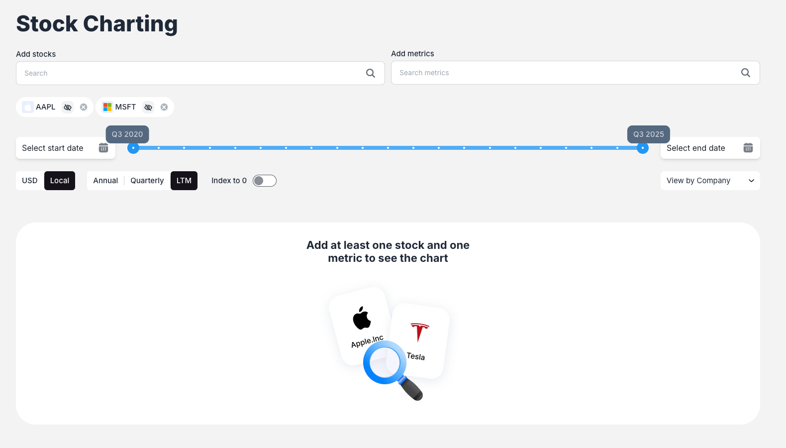 Use the "Add stocks" search bar to find and select companies you want to analyze. Simply type a company name or ticker symbol (e.g., "MSFT" for Microsoft, "AAPL" for Apple) and select from the dropdown results. You can add multiple stocks to create comprehensive comparisons.