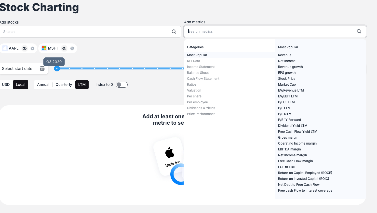 Click the "Add metrics" search bar to choose the fundamental data points you want to chart. The system offers: