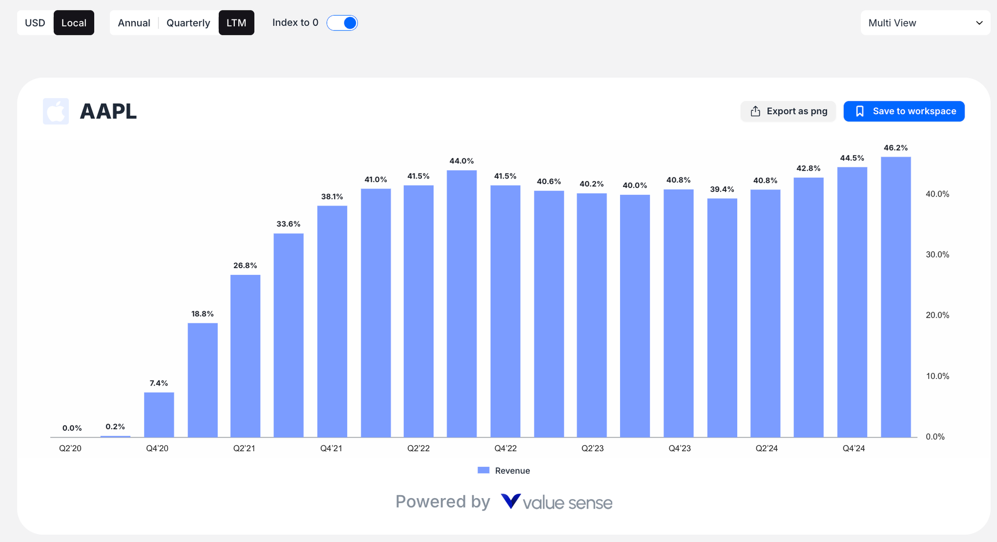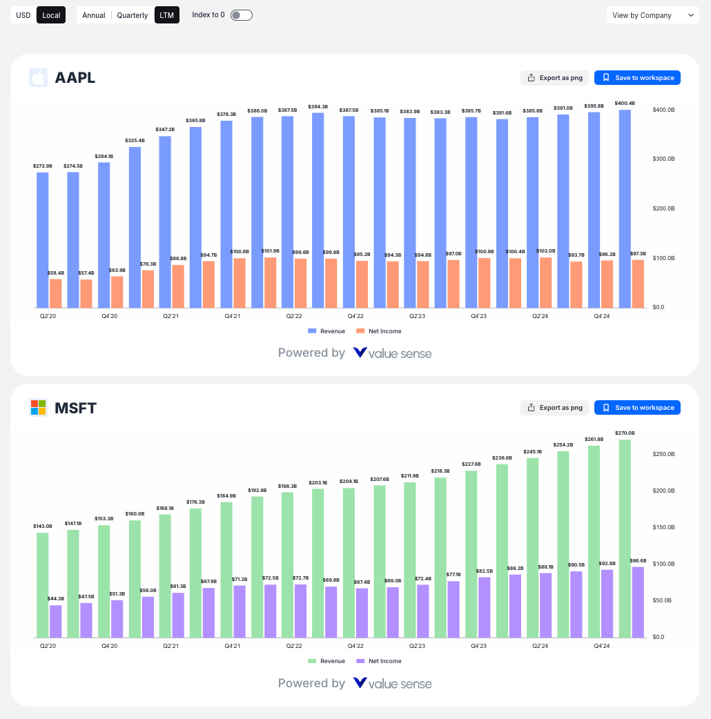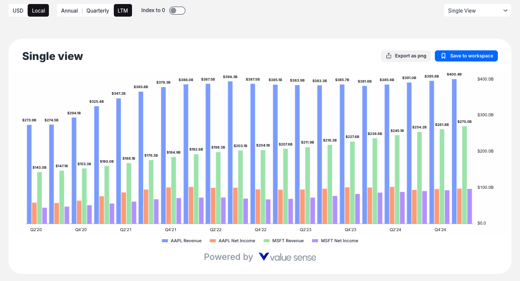 - Period buttons (Annual, Quarterly, LTM) to adjust data frequency