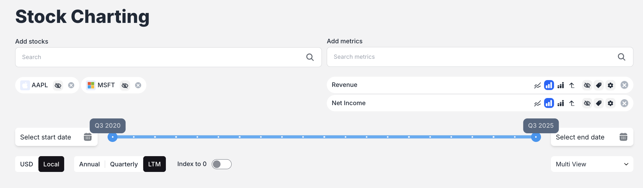 - Multi View: Creates individual charts for every unique combination of stock and metric