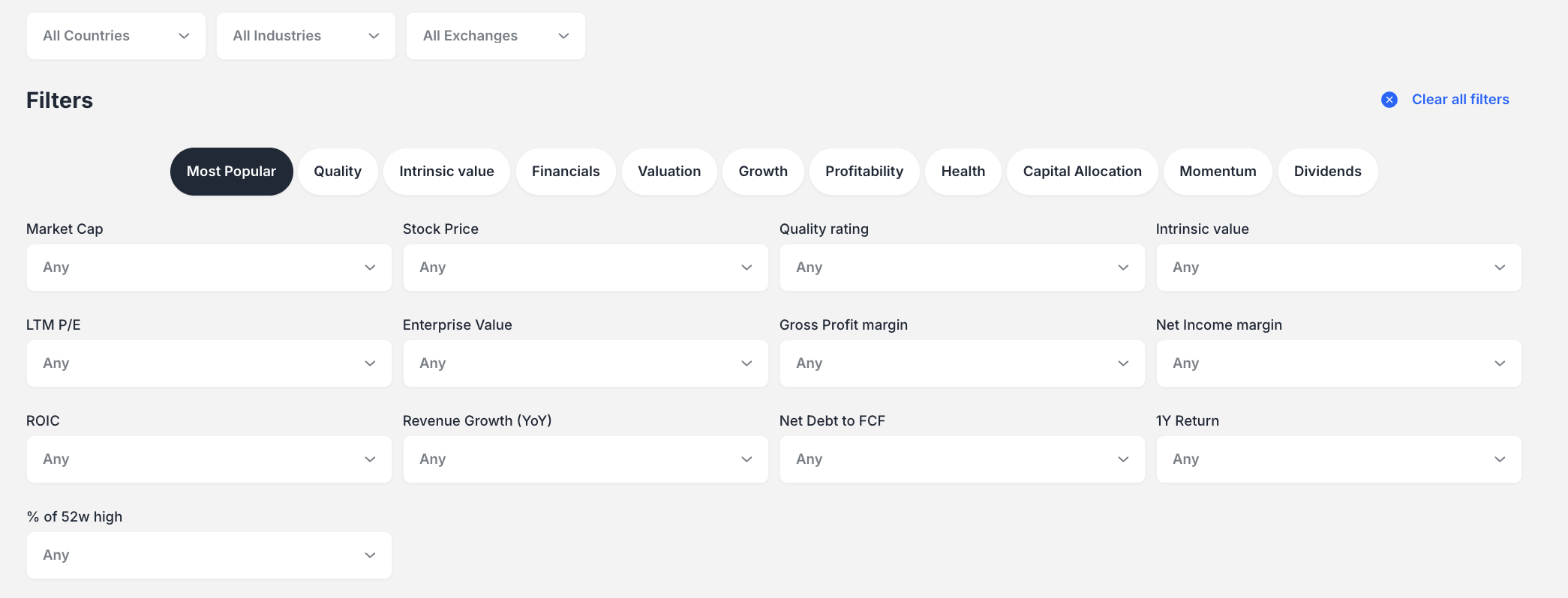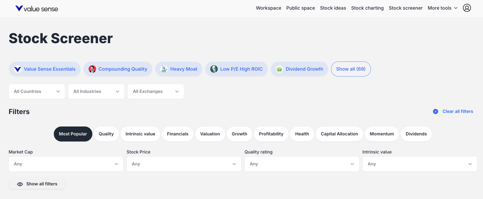 - Most Popular: Market Cap, Stock Price, Quality rating, Intrinsic value