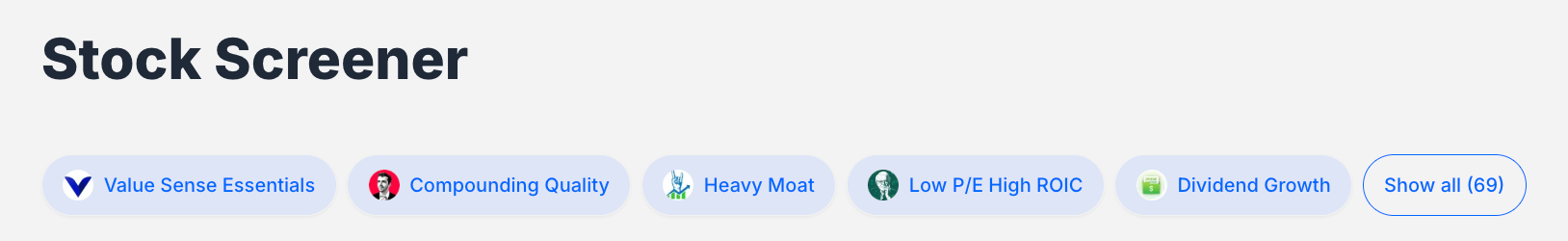 ValueSense's Stock Screener is a powerful tool that helps you find investment opportunities by filtering stocks based on fundamental criteria. Whether you're looking for undervalued companies, dividend champions, or growth stocks, the screener provides both quick-start options and detailed customization capabilities.