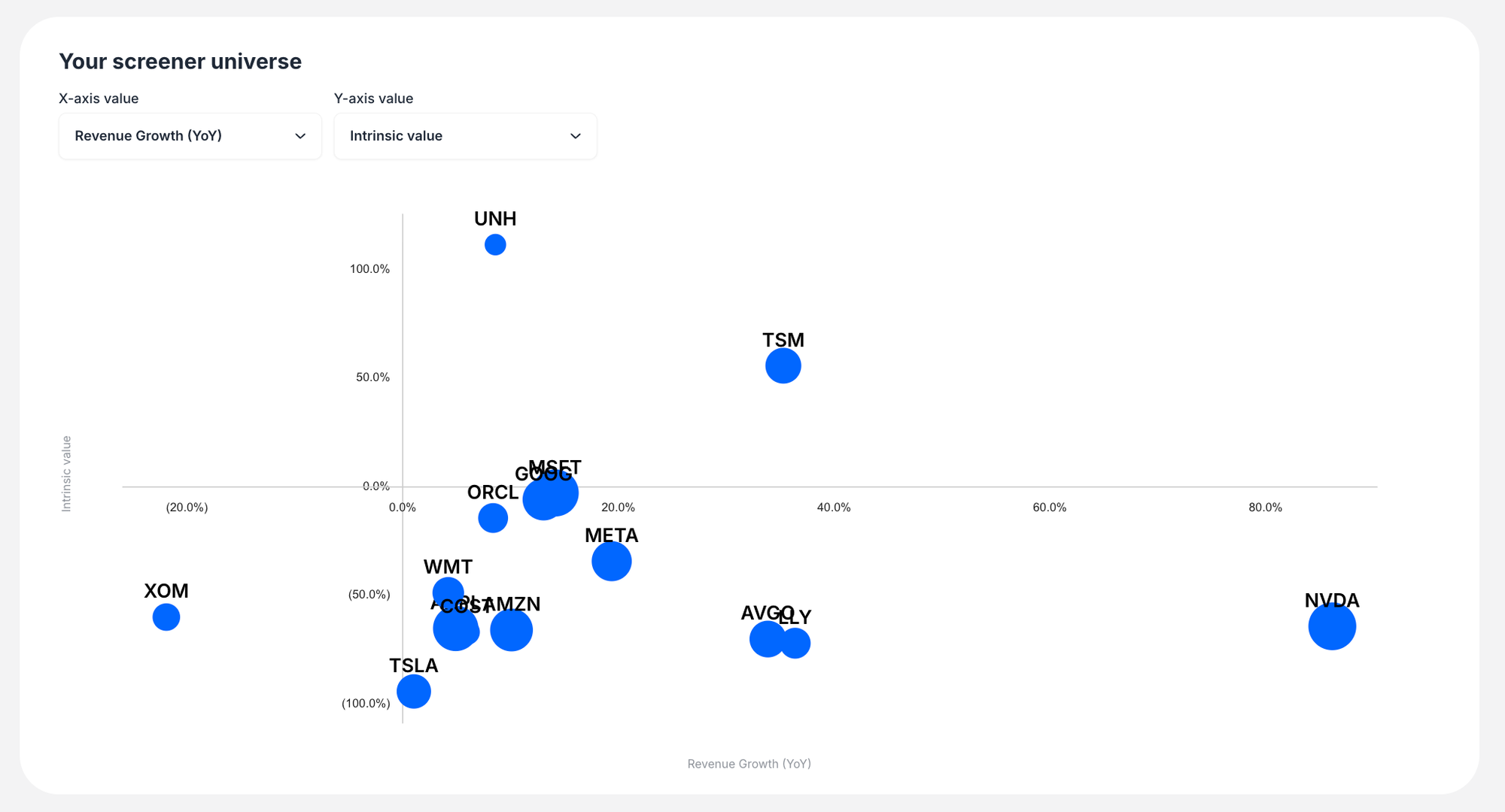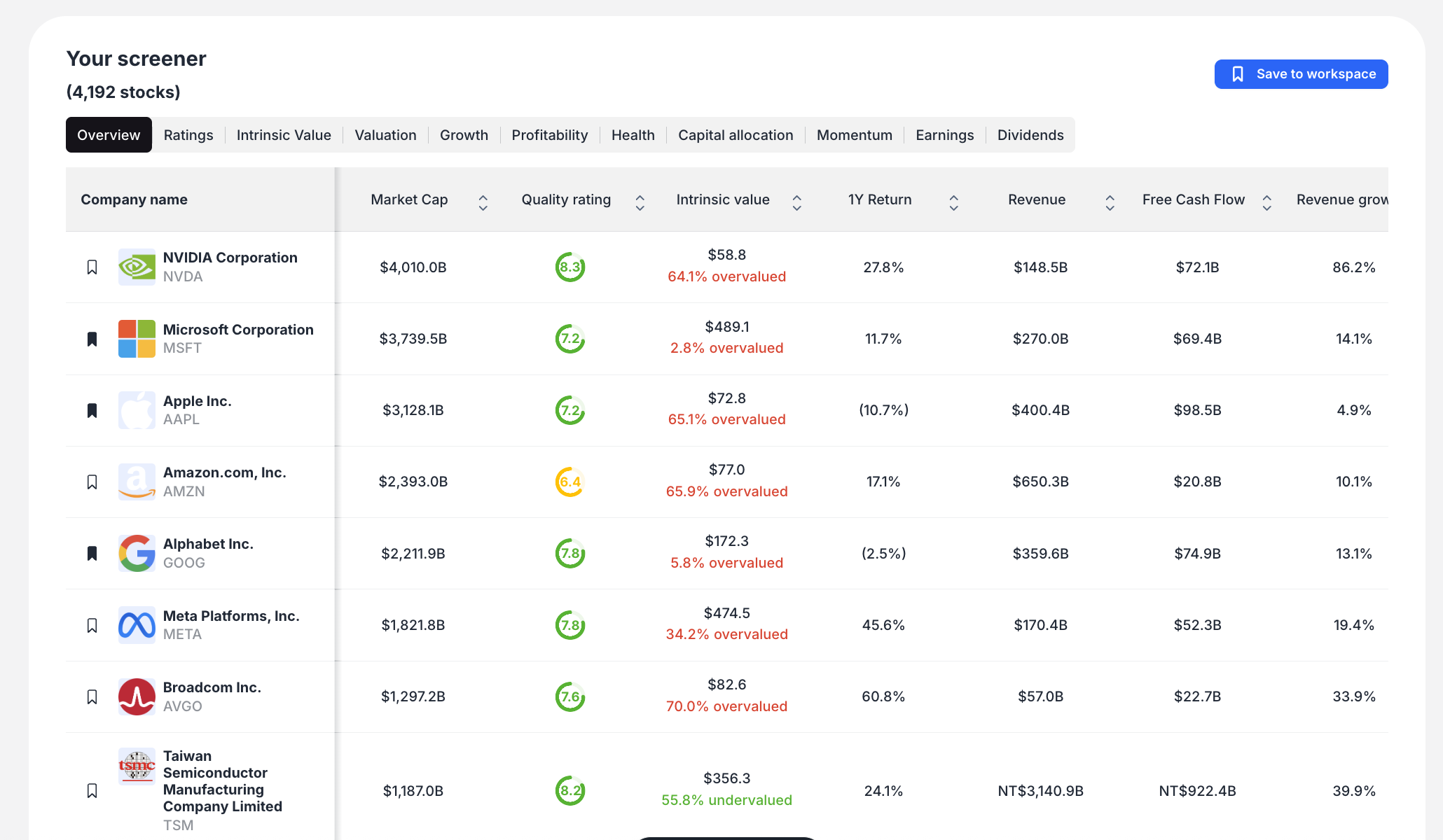 The Stock Screener transforms complex fundamental analysis into an intuitive, visual experience that helps you discover investment opportunities aligned with your specific criteria.
