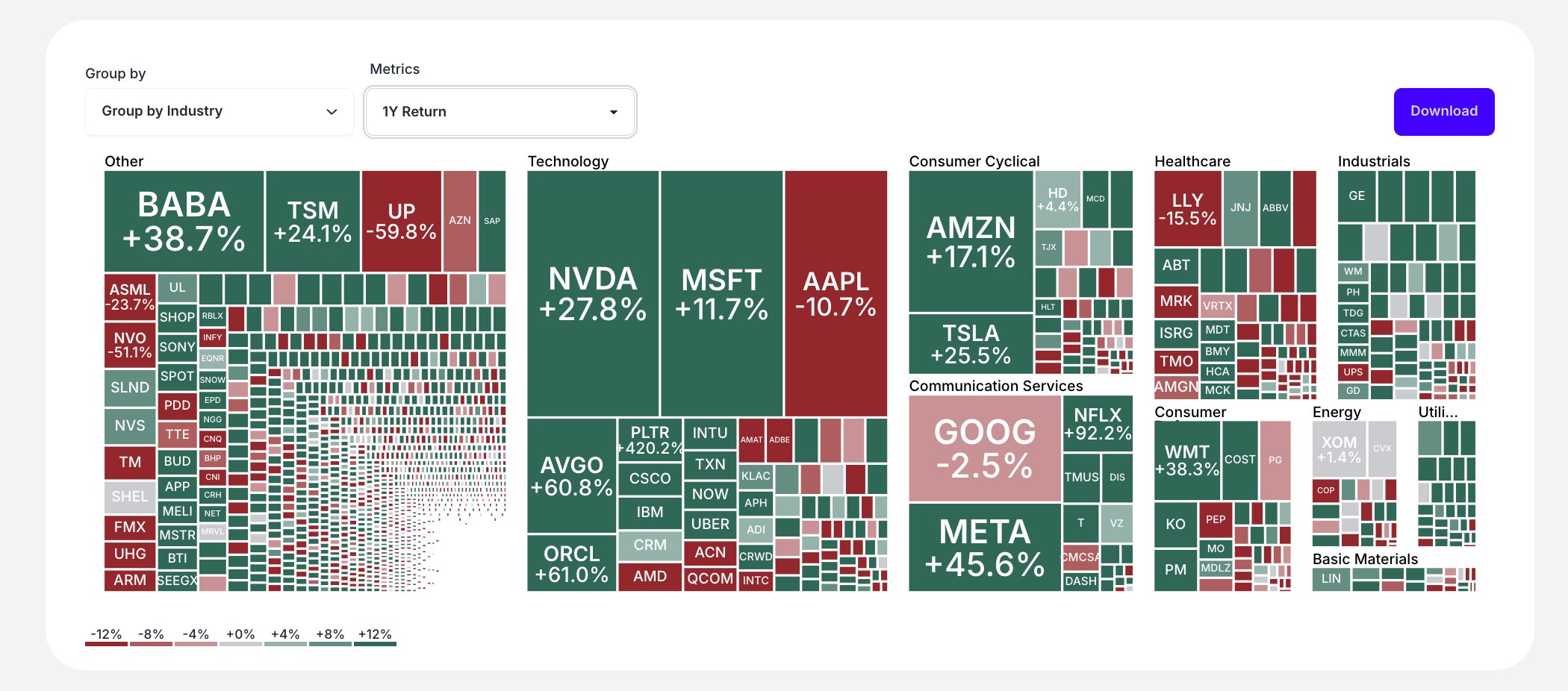 - Heat Map: Color-coded performance visualization grouped by industry