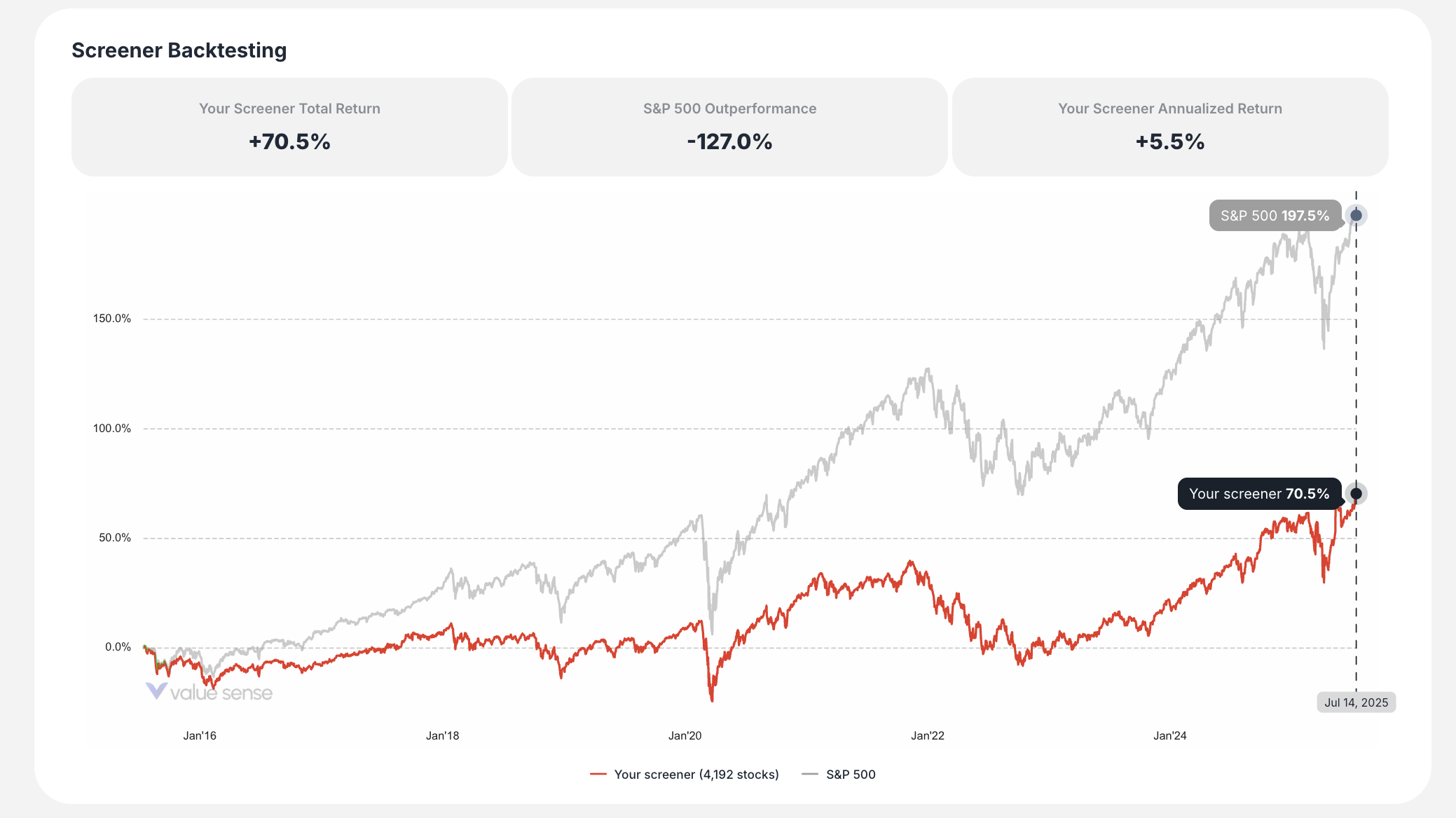 - Backtesting Chart: Historical performance comparison of your screener vs. S&P 500