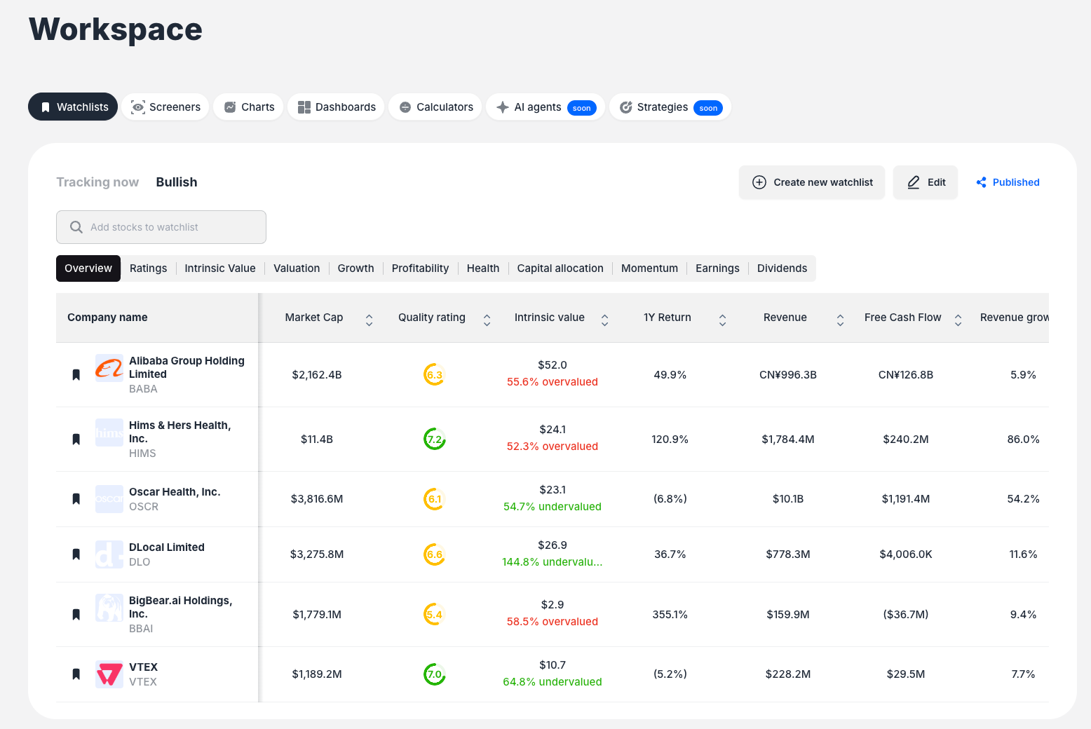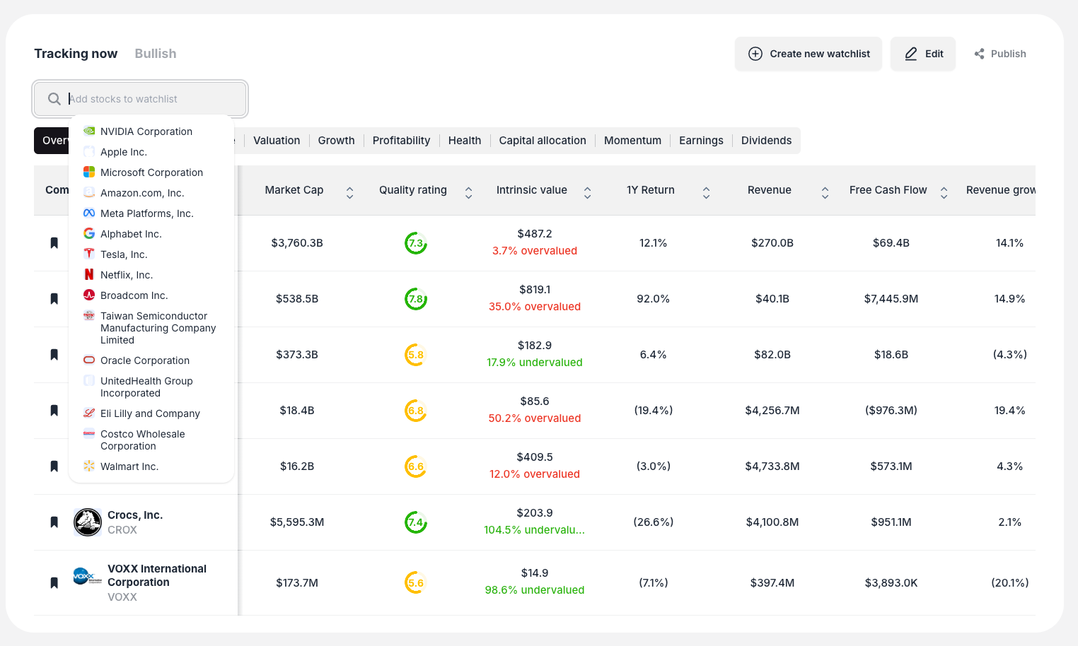 - Valuation Indicators: Real-time intrinsic value and over/undervalued percentages