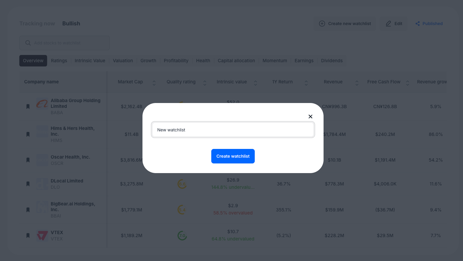 Name Your List: Enter descriptive name in modal window (e.g., "Growth Stocks", "Bullish", "Q3 Watchlist")