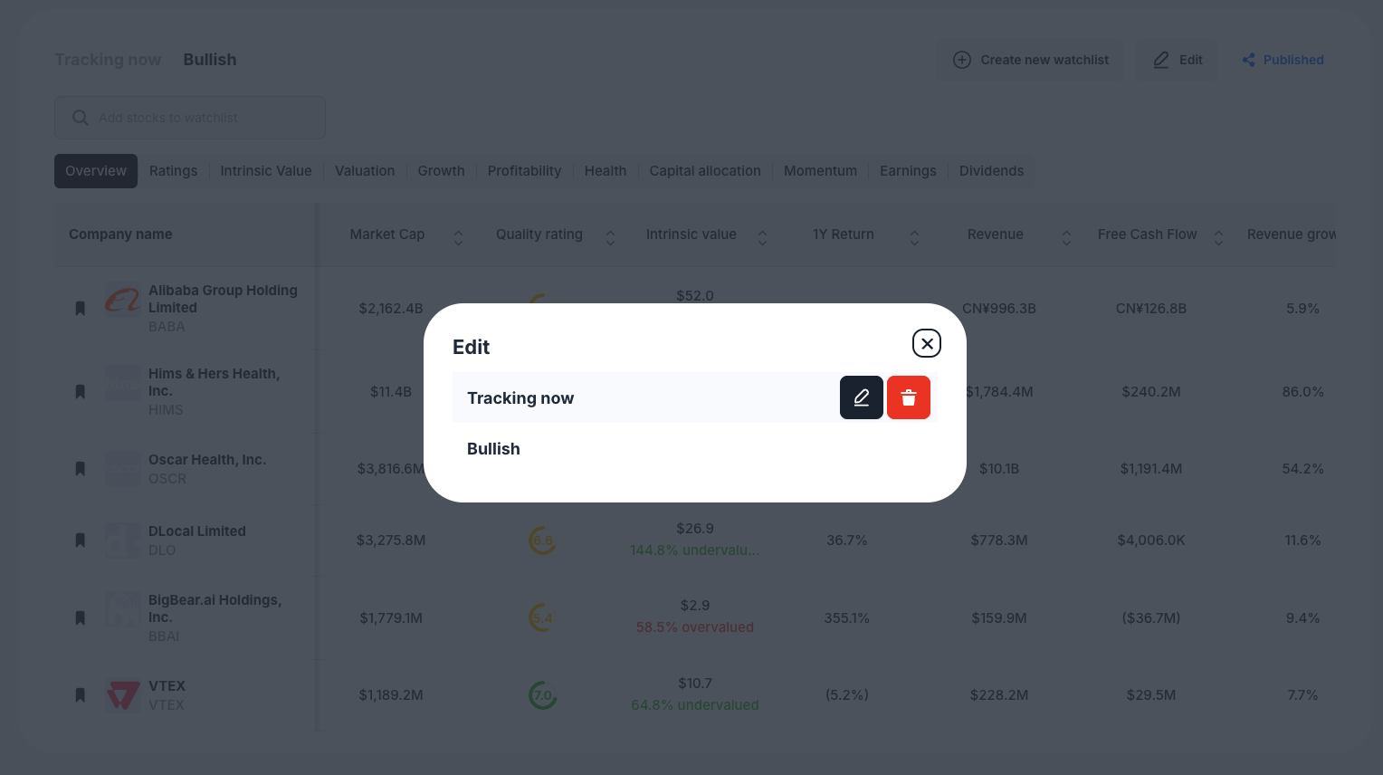 - Edit Function: "Edit" button opens modal with all existing watchlists