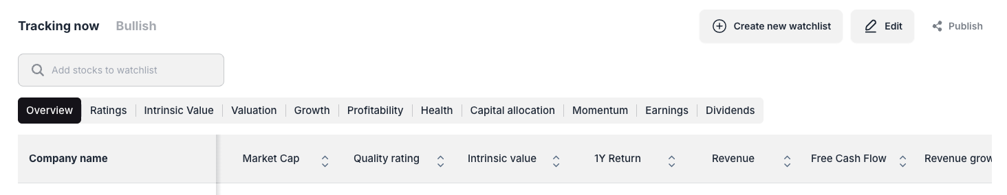 The Stock Watchlist feature serves as a centralized hub for monitoring and analyzing your investment ideas and portfolio holdings. Located within the ValueSense Workspace, this comprehensive tool allows users to create multiple custom watchlists, track real-time performance data, and analyze stocks through various metrics and visualizations.