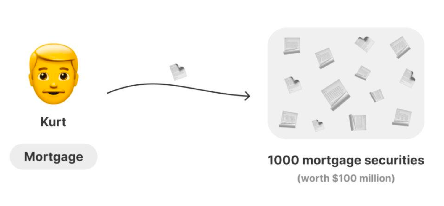 Kurt bought his house on loan and this is his real deal and real house. You made a bet with your neighbour whether Kurt would repay his debt, and then other people made a bet about whether you would win the bet. And a smart banker passing by offered to buy out the bet and sold it to a distant investor on another part of the planet. Obligations began to be bought up and resold.