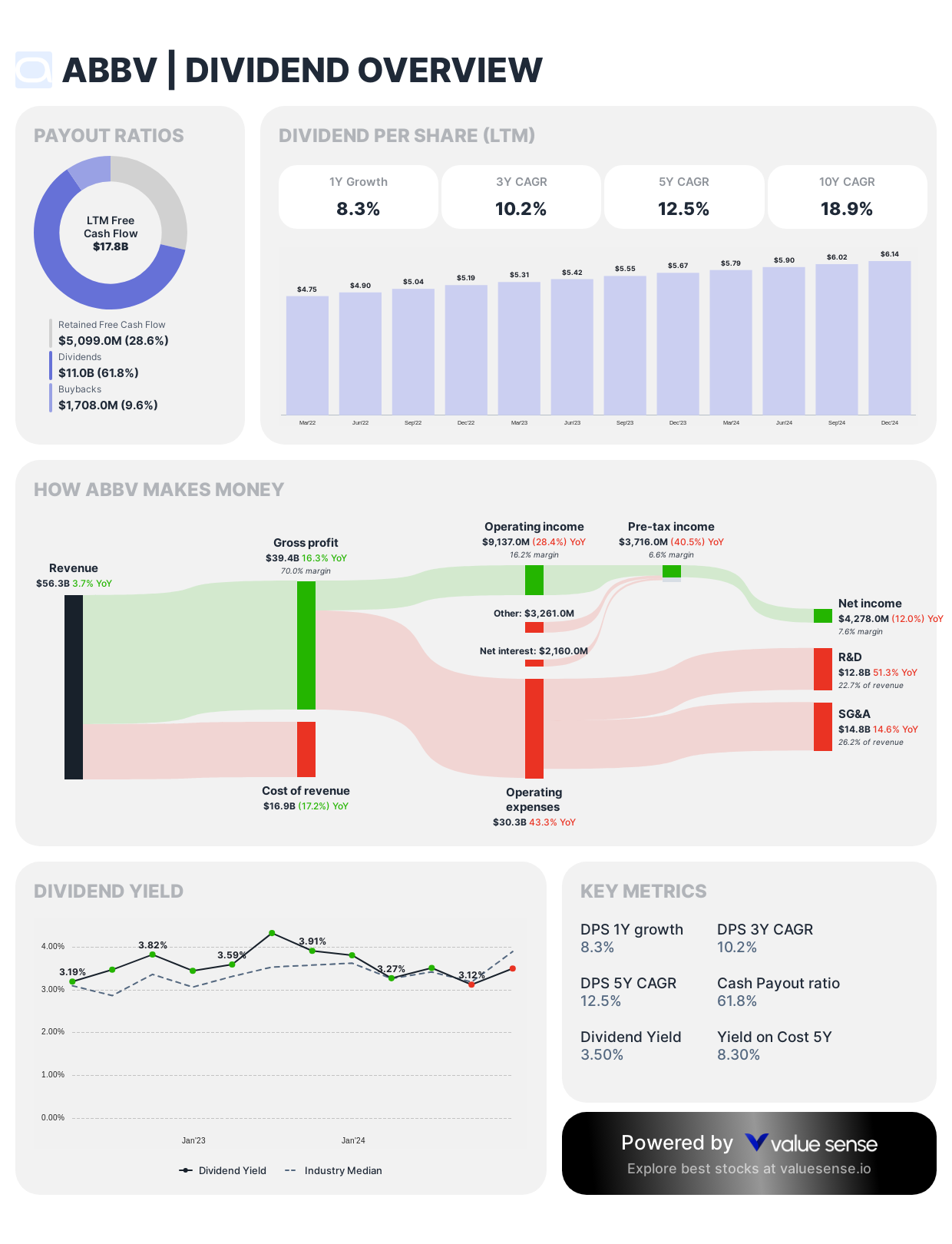 Dividend Framework: Since its 2013 Abbott Laboratories spin-off, AbbVie has established an accelerated dividend growth trajectory, demonstrating aggressive annual increases despite patent cliff concerns for its flagship Humira medication.