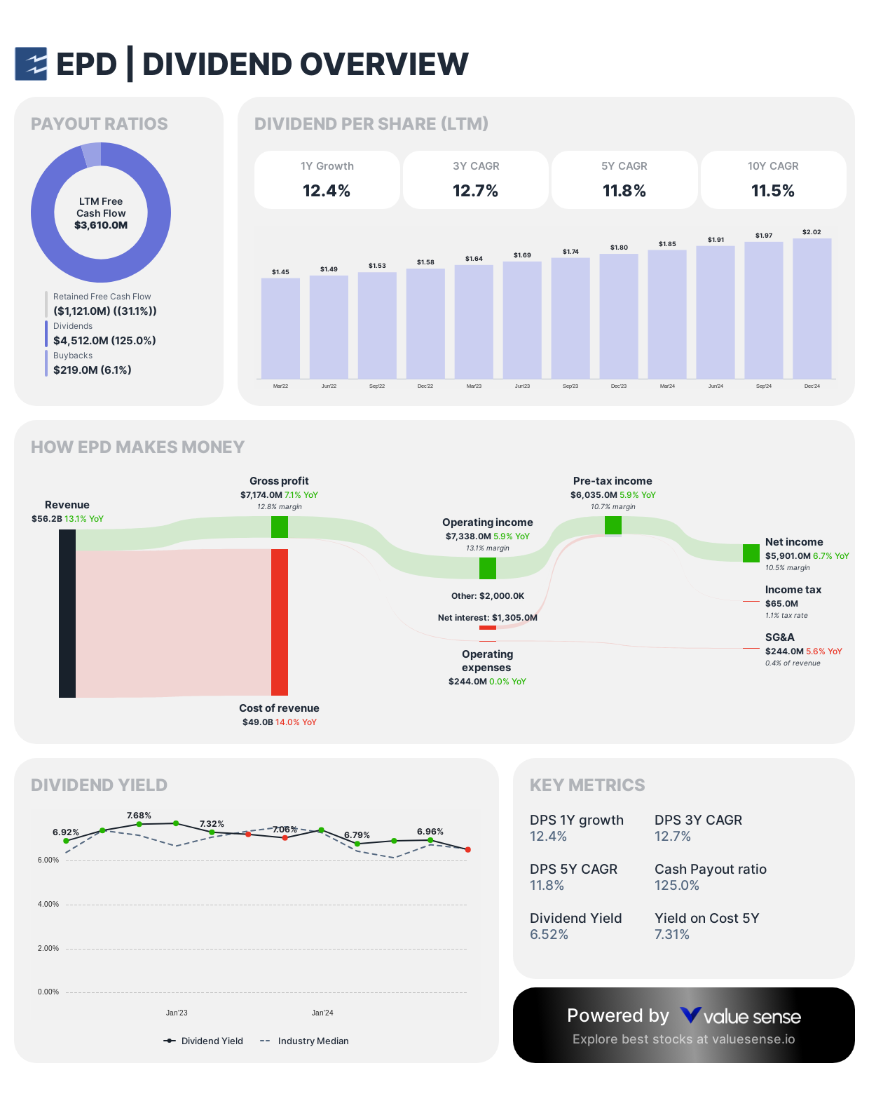 Dividend Framework: As a midstream master limited partnership (MLP), Enterprise Products Partners structures its dividend policy around distributable cash flow, delivering exceptional yield through quarterly distributions with consistent sequential increases spanning over 20 years.