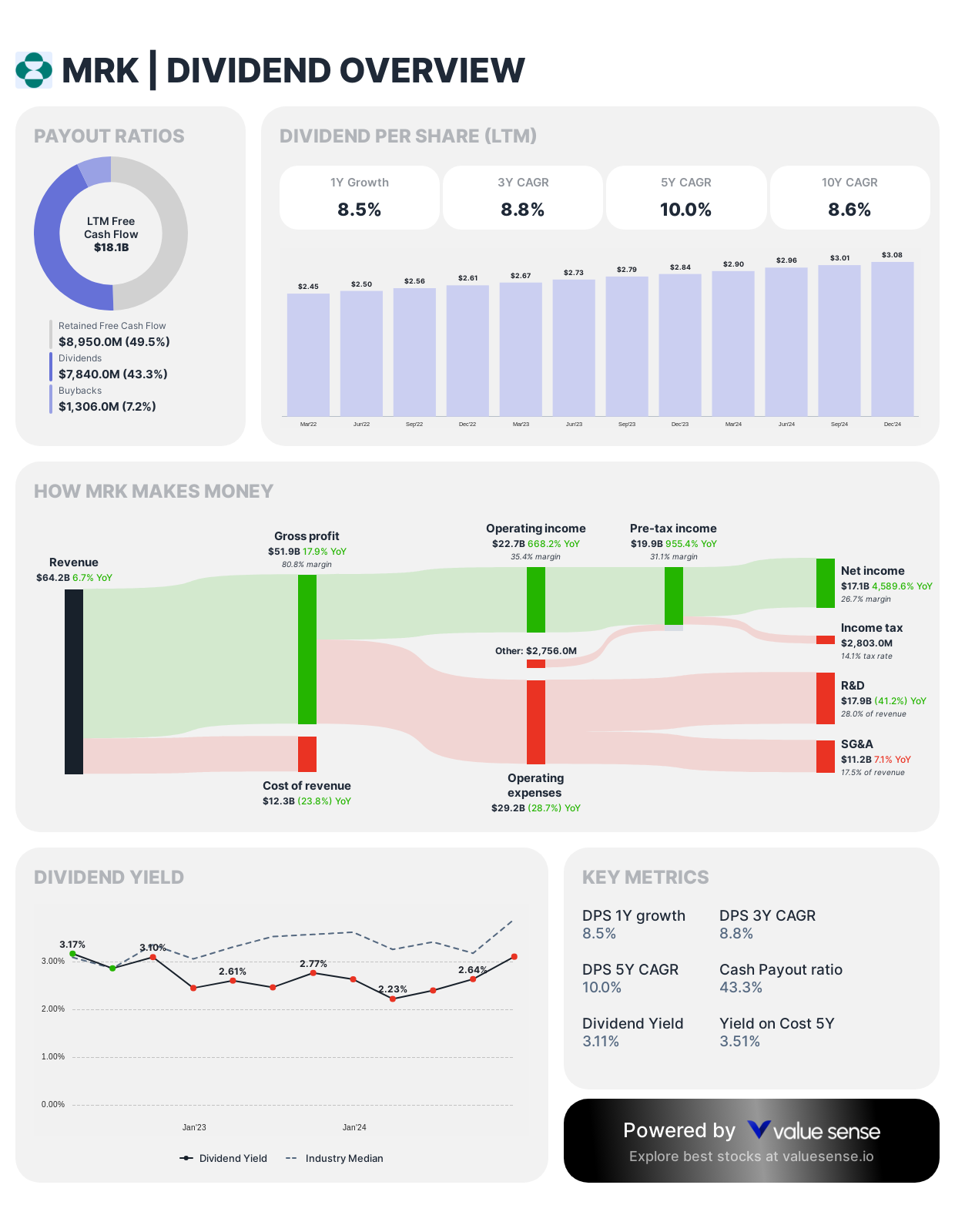 Dividend Framework: Merck employs a conservative dividend strategy prioritizing financial flexibility for R&D investment and strategic acquisitions while maintaining modest but reliable income for shareholders.