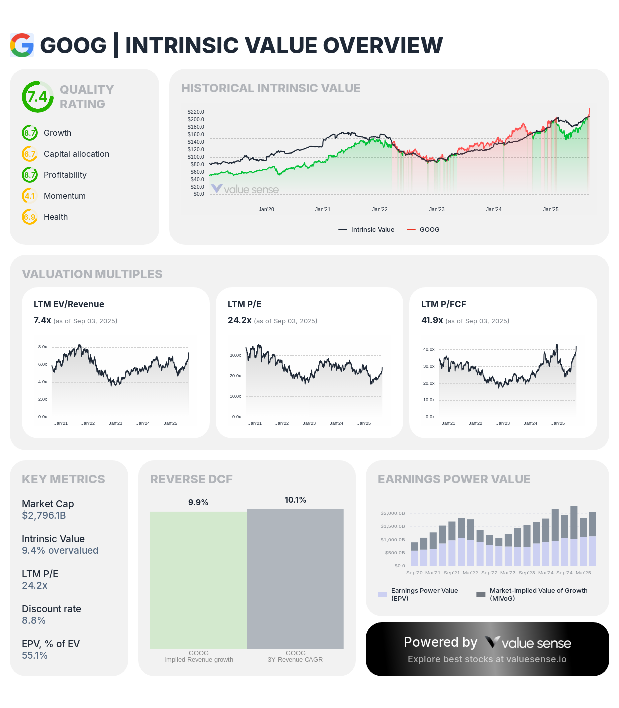 - P/E Ratio: 24.2x reasonable given search dominance and cloud growth