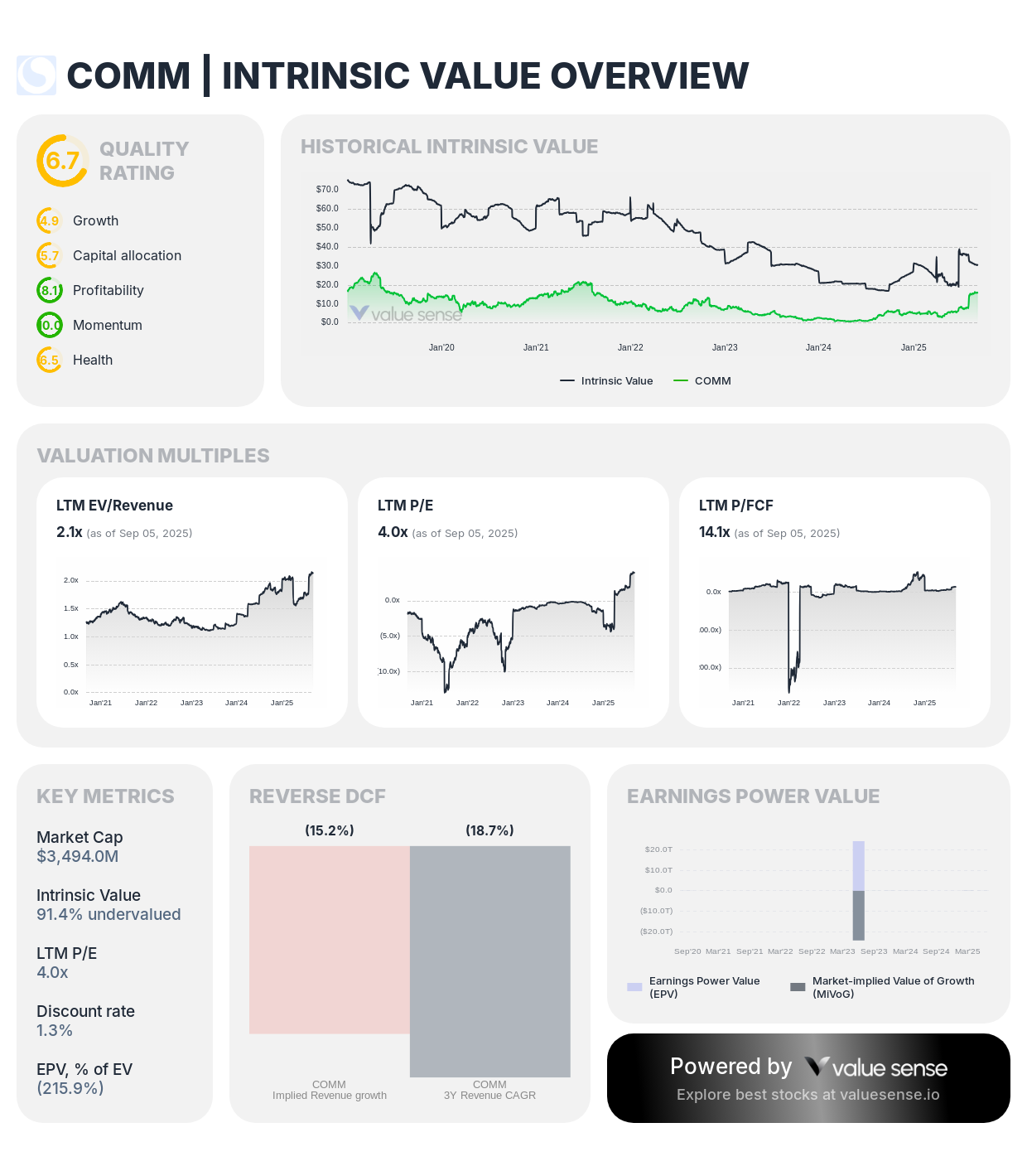 Investment Thesis: COMM represents a classic value recovery play in telecommunications infrastructure. The company's leading position in network equipment and services positions it to benefit from 5G rollout acceleration, broadband expansion initiatives, and enterprise connectivity upgrades.