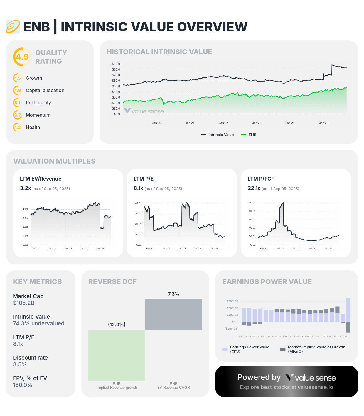 Enbridge shows 74.3% undervaluation with exceptional revenue growth and stable cash flows from diversified energy infrastructure