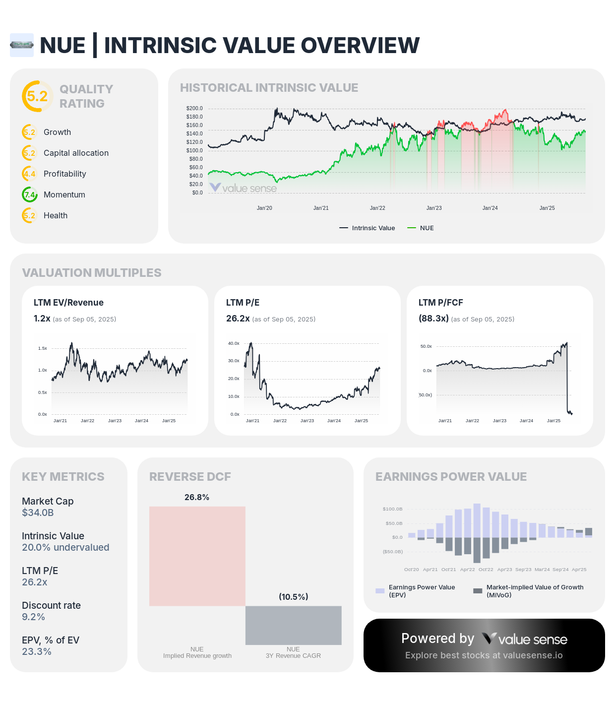 | NUE | $34.0B | 20.0% | 5.2 | 5.8% | 1.9% | -1.2% | Steel infrastructure demand |
