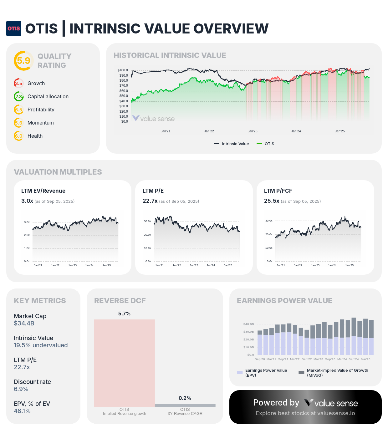 | OTIS | $34.4B | 19.5% | 5.9 | 0.1% | 27.1% | 9.5% | Service model stability |