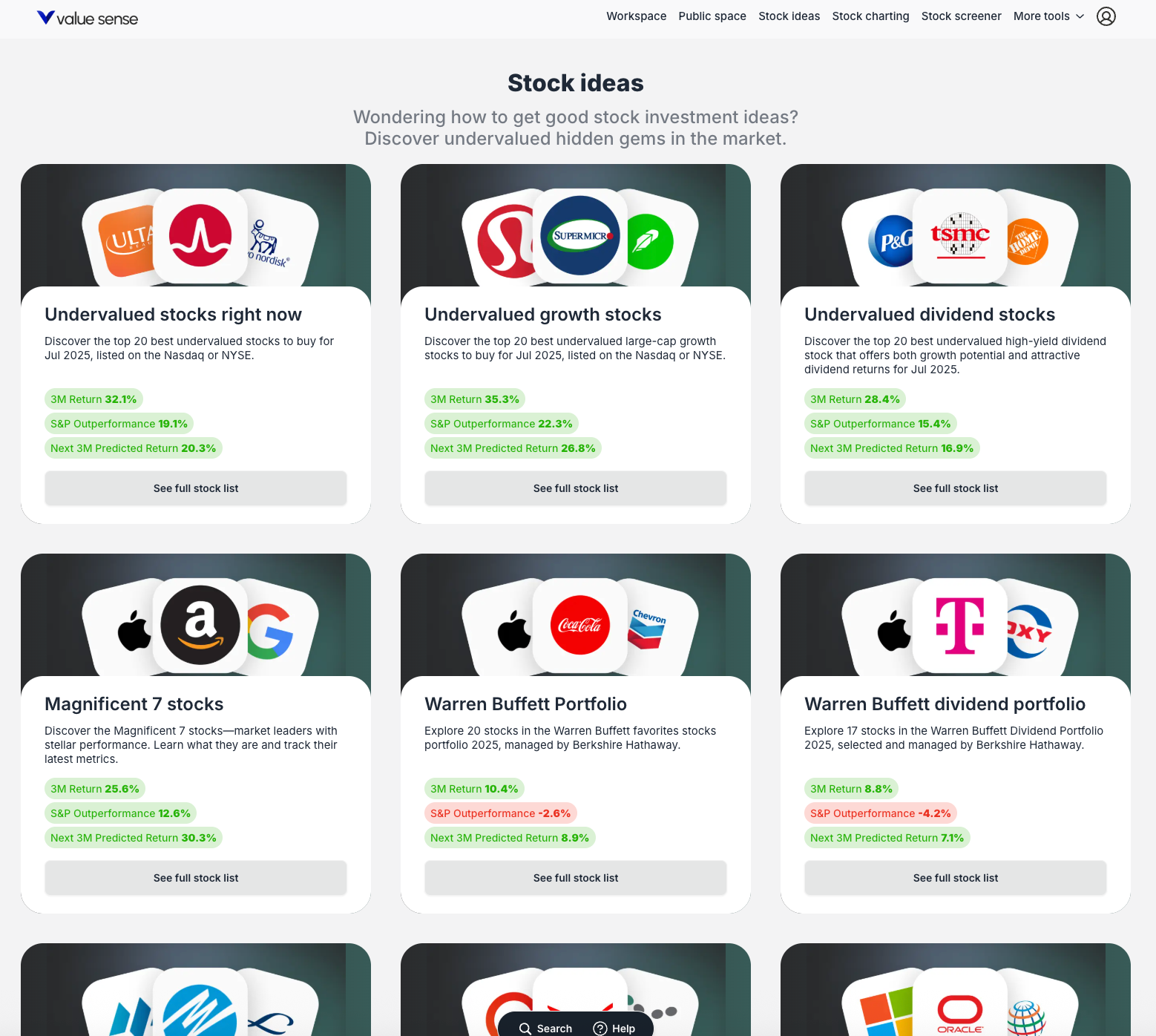 ValueSense's Stock Ideas feature provides a curated library of investment strategies and themed stock lists, making it easy to discover opportunities aligned with proven investment approaches. Instead of starting from scratch, you can explore professionally researched lists based on popular strategies, legendary investors, and specific market conditions.